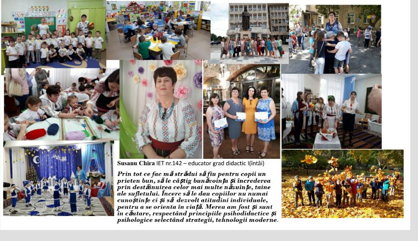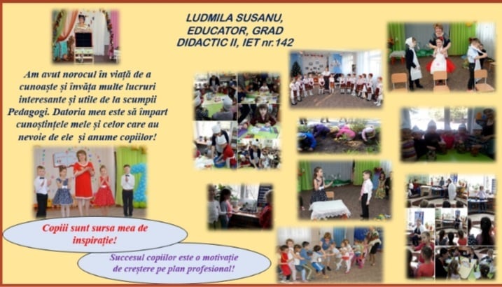 Instituția de educație timpurie nr.142 susține campania ”Profesorul – amprentă a eternității!” si vine cu istoria de succes a educatorului Susanu Ludmila, grad didactic II. Un educator cu vocație se regăsește în succesele copiilor săi! Acesta este motto-ul Dnei Susanu Ludmila, care an de an depune în munca cu copiii dragoste necondiționată, creativitate, altruism, insistență, profesionalism. Succese și curaj, dna Educatoare!